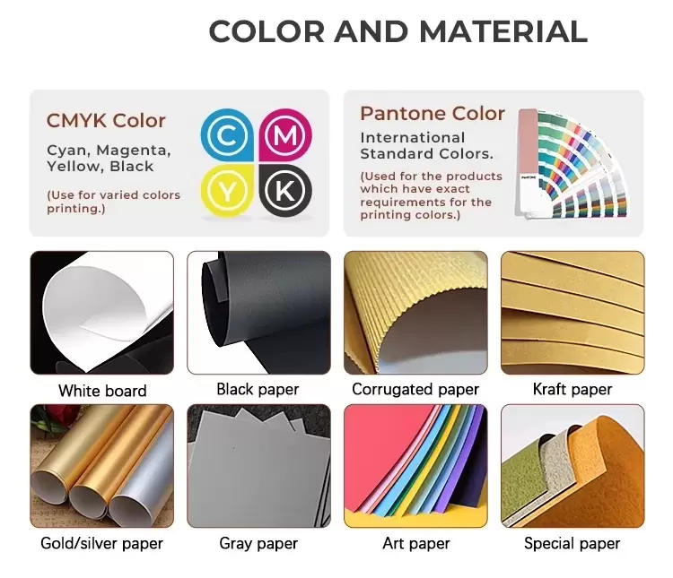 Material: Corrugated paper, white cardboard, black cardboard, Kraft paper, Ivory paper , Art Paper, CCMB, CCNB and so on